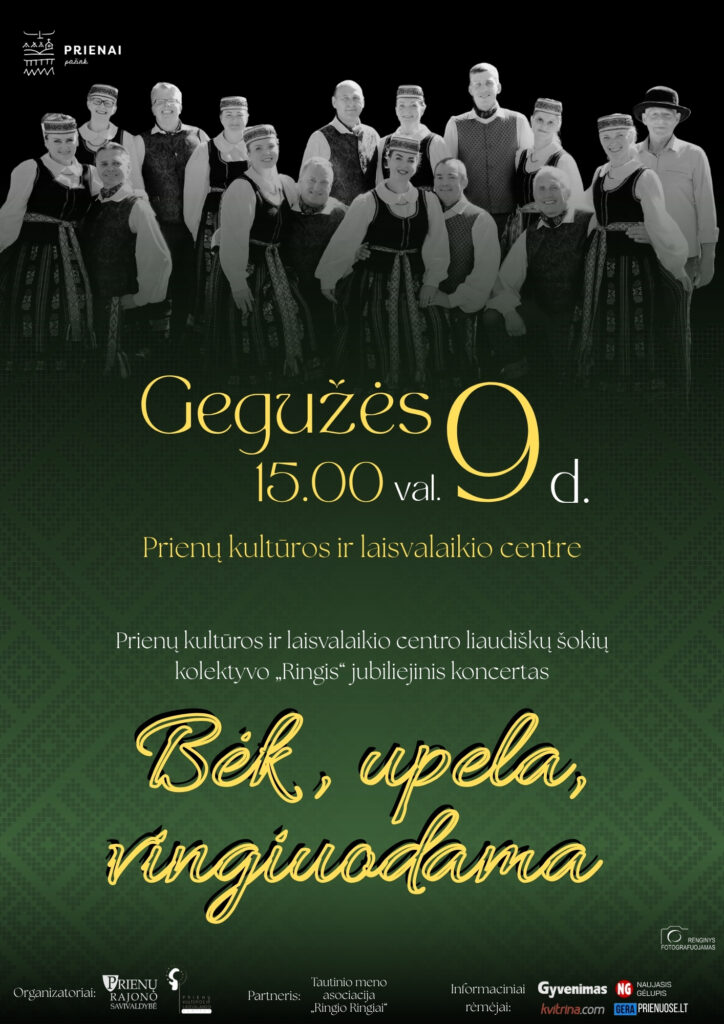 Gegužės 9 d. (šeštadienį) 15.00 val. Prienų kultūros ir laisvalaikio centre vyks Prienų kultūros ir laisvalaikio centro vyresniųjų liaudiškų šokių kolektyvo „Ringis“ jubiliejinis koncertas „Bėk, upela, vingiuodama“.
