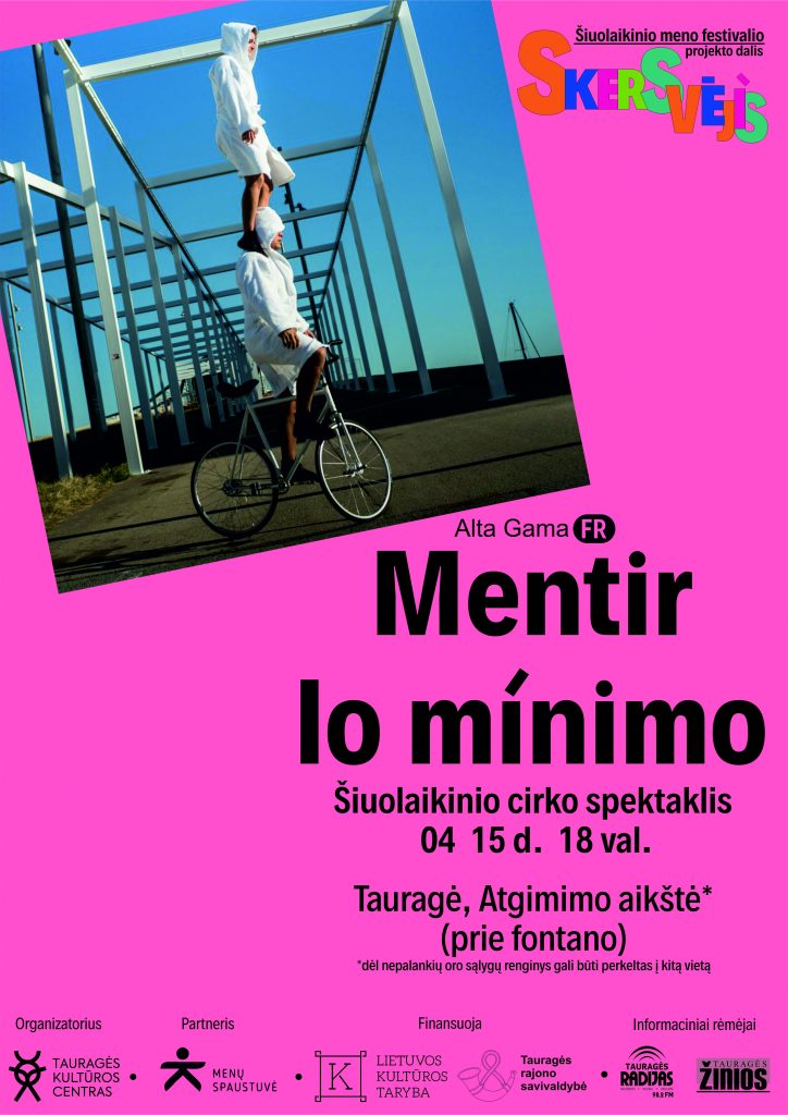 Balandžio 15 d. 18 val. Tauragės  Atgimimo aikštėje (prie fontano) – šiuolaikinio cirko spektaklis „Mentir lo minimo“ (dėl nepalankių oro sąlygų renginys gali būti perkeltas į kitą vietą).