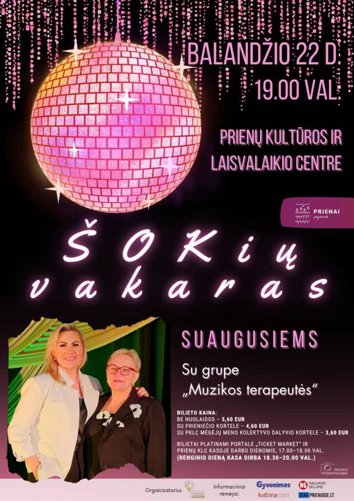 Balandžio 22 d. (trečiadienį) 19.00 val. Prienų kultūros ir laisvalaikio centre – šokių vakaras suaugusiems su grupe „Muzikos terapeutės“.