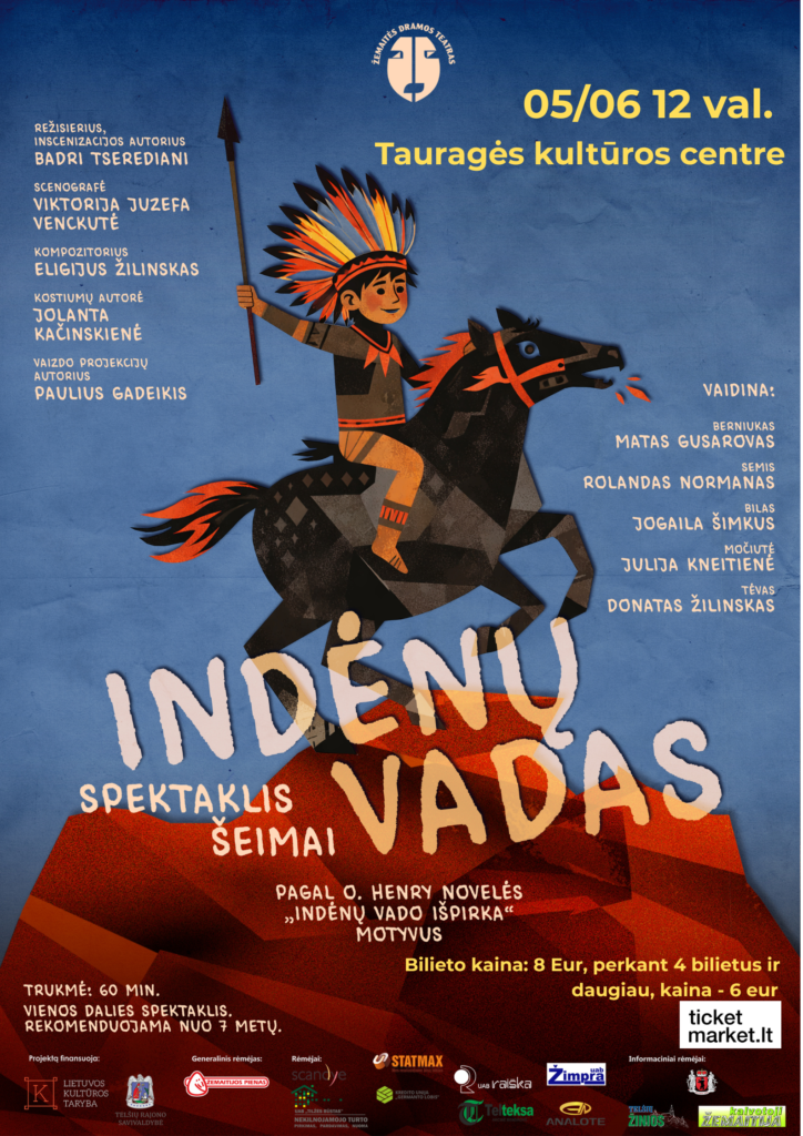 Gegužės 6 d. 12 val. Tauragės kultūros centre spektaklis šeimai „Indėnų vadas“, pagal O. Henry novelės „Indėnų vado išpirka“ motyvus. (TELŠIŲ ŽEMAITĖS DRAMOS TEATRAS)